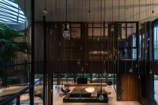 The ground floor is open and completely transparent, without any dividing wall, giving a visual connection across the whole site. The functional space is designed to be directly opened to the courtyard and the surrounding landscape. From this floor, residents can have a direct view of the automobile collection. The structure is minimized, utilizing long spanning beam, giving the space its openness and elegance.