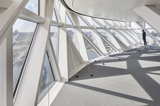 While most of the triangular facets are transparent, some are opaque. This calibrated mix ensures sufficient sunlight within the building, while also controlling solar load to guarantee optimal working conditions. At the same time, the alternation of transparent and opaque facade panels breaks down the volume of the new extension, giving panoramic views of the Scheldt, the city and the Port as well as providing enclosure.