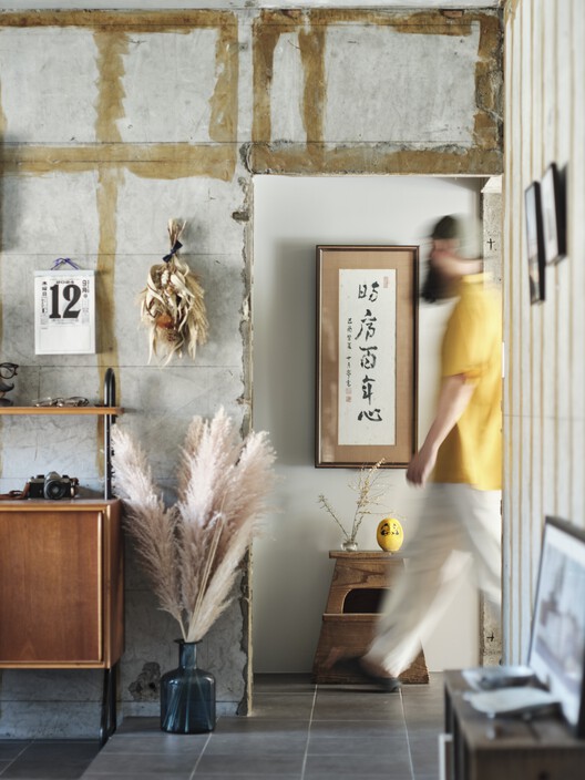 As the renovation progressed, all conventional wall, ceiling, and floor coverings were stripped away, revealing the apartment's raw structure and the remnants of its past. Choosing to retain the resulting colors and patterns exposed from this process added a distinctive touch to the apartment's design.