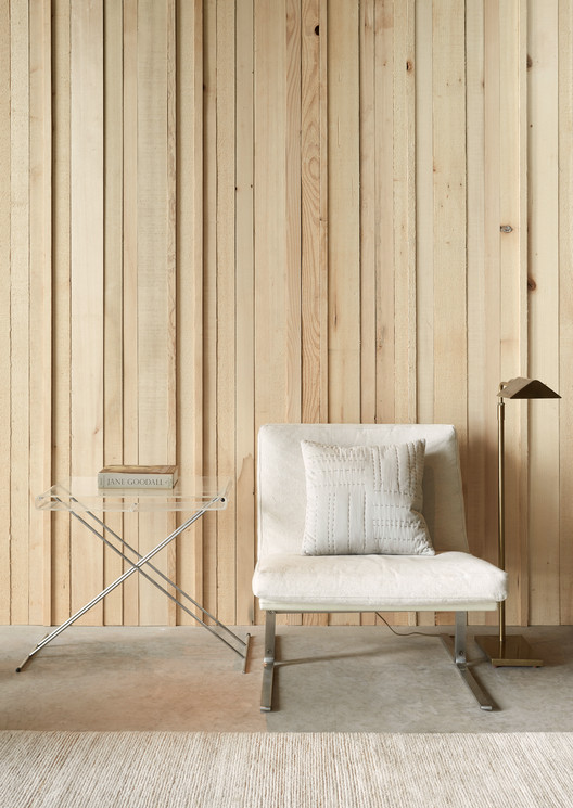 The cabin is intentionally subdued in color and texture, allowing the lush natural surroundings to take precedence. Simple, readily available materials are used: wood-framed walls are sheathed in plywood or recycled boards, inside and outside; doubled pairs of steel columns support beams that in turn support exposed roof structures. Interior spaces appear to flow seamlessly to the outside as materials continue from inside to out through invisible sheets of glass. Three mature fir trees have been accommodated within the design and allowed to grow through openings in the deck, one of them exiting through an opening in the roof.