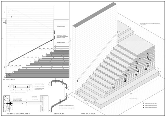 The Main staircase to the upper level, is an assemblage of thick wood akin to a stack in a drying yard, the stair rail, is crafted out of rosewood as a precious object with the bent corners of cast brass, pronouncing an elegant luxury along with a sense of TIMELESSNESS.