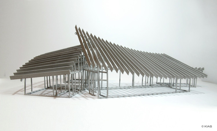 In order to form variable cross section suitable for each function, roofs were designed as curved surface like gently twisted leaves. Combination of a concave and a convex roof configures from a high ceiling expansive space to an introverted compact rooms. Every roof has been designed as a Ruled Surface in which straight Laminated Veneer Lumber joists are arranged continuously to form an organic geometry. A series of wooden joists is exposed on the ceiling highlighting the dynamic spatial characters of each living space.