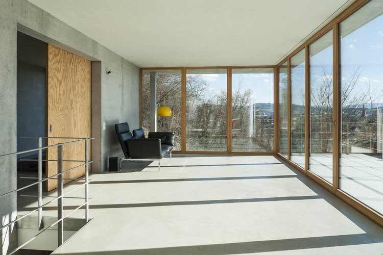 The varying projections of the storey ceilings form terraces and protruding roofs, creating specific exterior spaces as counterparts to each interior space. This effect molds the character of the interior spaces via the large windows. For instance the rooms facing the hillside and the undergrowth are shaded, cool and somewhat introverted, while the counterpoised rooms facing the valley almost become loggias when the windows are opened. Linen curtains and horizontal slat blinds allow the degree of light permeability to be controlled. The large protruding roofs prevent an over-exposure to sunlight in summer, whilst in winter the low-lying sun warms the heat-retentive concrete.