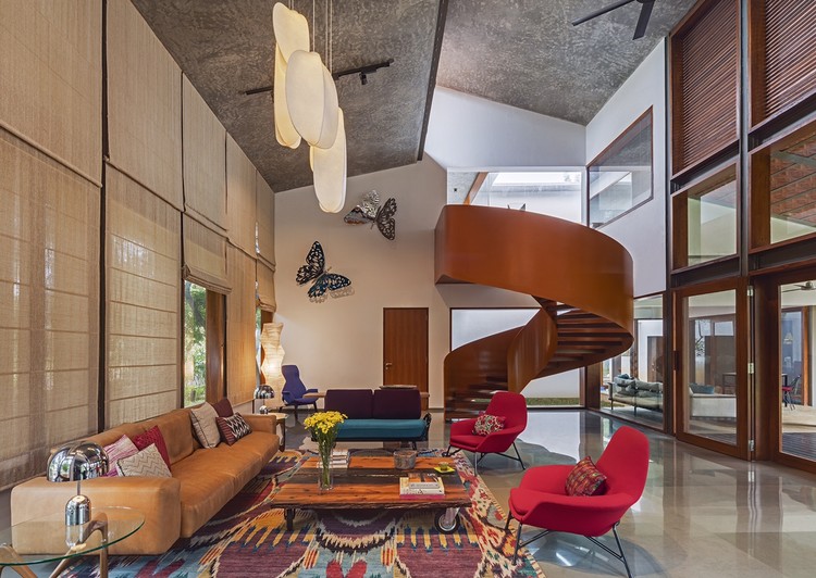 The central feature of the living space is a burnt orange spiral staircase sculpted out of a shell of mild steel and housing timber treads. The Large expanses of grey Kota are contrasted with a bright color palette of turquoise, violet, red and mustard. The bold Ikat patterned carpet provides a vibrant base on which pieces by Moroso, Minotti, Riva and Poliform sit alongside other furniture designed by Khosla Associates. The central cluster of Mori fabric pendant lamps were sourced from New York based design house Rich Brilliant Willing, complemented by other light fixtures by Tom Dixon and Isamu Noguchi. The butterfly sculpture on the wall is Sunil Gawde’s 'Secret Garden' and other paintings are by young Bangalore based contemporary artists Shivkumar and Suresh Kumar.