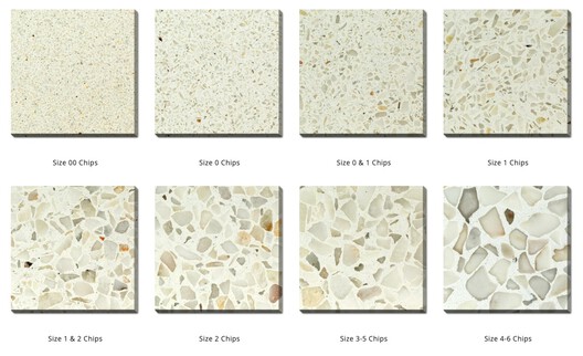 Each terrazzo mix is customizable, offering a wide range of design possibilities. The epoxy matrix, serving as the background color, can be pigmented to precisely match any paint fan deck color, while the aggregate blends can incorporate various sizes and materials, including marble, stone, glass, and other chips.