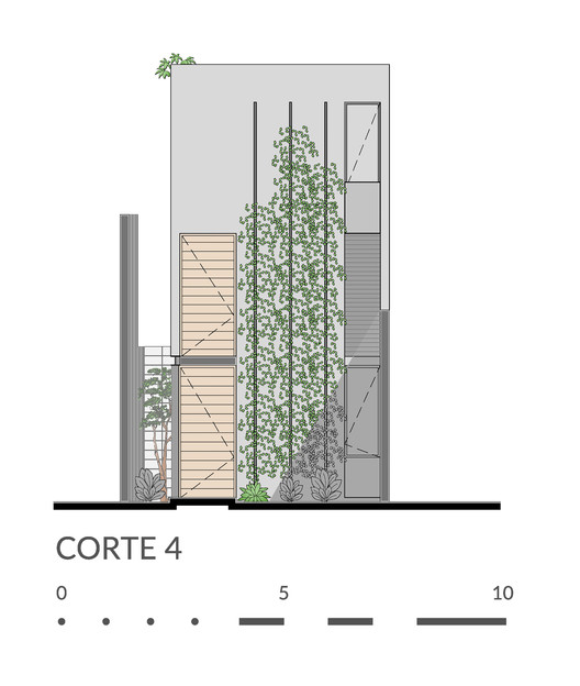 The elements of passive conditioning become an integral part of the design, the pool that cools the air before traversing the house, the glass wall to the east that lets you open or close the space and control the flow and volume of air, sliding glass doors to the air chimney that create natural light from the north and increased ventilation, a green wall to the west reinforcing the thermal barrier, permaculture planters that always kept with water avoid overheating the access area and intermediate courtyards as the transition from access to living area and to the inner courtyard of the bedroom.