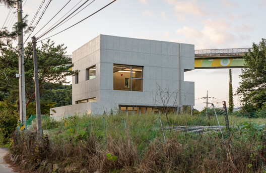 While these opposing elements make relationships, they create a space that is both very closed and very open. There is a lounge on the second floor for the group that loves to cook along with wood. A functional layer is created by arranging a bathroom, a refrigerator, a pantry, and a shower stall in one line. Moreover, an island sink is placed for them to cook and talk face-to-face. The remaining space is left empty for them to fill in by making goods with wood. A large frame is made for each location with a good view so that they can enjoy the outside from the inside. A door to the roof is located at the end of the functional line. The staircase to the roof, not covered, is connected to the staircase from the first to the second floor. A long fenestra is created so that people can enjoy the forest next to the site while climbing up the stairs. When reaching the roof, a space allows people to enjoy a panoramic view of the landscape that people can see in bits and pieces through the frame. This project is an insulated concrete sandwich building.