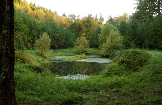 The design attempts to make the pond and residence a single entity in which the owners can enjoy and connect with the wild creatures that come to the water on both regular and varied schedules. To this end, the building of Douglas Fir and Cor-ten steel was placed as a bridge across the north end of the pond. The pond itself was enlarged and loosely ordered to integrate with the structure of the residence.