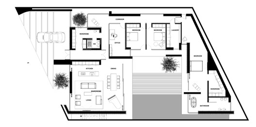 Text description provided by the architects. A single-storey pavilion of glass, concrete and wood, located in the suburbs of Chisinau.Flat plot of a trapezoidal shape, with three sides surrounded by the existing low-rise buildings, which dictated the shape of the house, but in spite of this plan forms the inner courtyard of regular shape with a swimming pool above which hovers home construction.Clear and concise exterior lines flow into the interior of the house.The house is spread over most of the area, all areas of the house are built around a courtyard.In addition to the common area in the house are three bedrooms of which two children and one master bedroom with bathroom en-suite bathroom and dressing room, as well as auxiliary facilities and a games room.Space home minimalist and restrained.