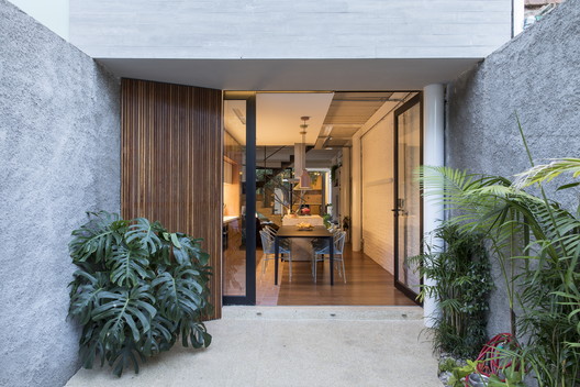 After the demolition, the urban plot measuring 4x24 meters was occupied with the new program which was divided into three levels: ground floor, upper and garden cover.