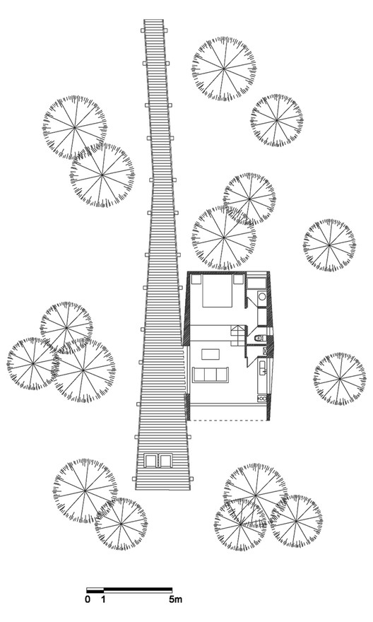 Located on the creek, elevated by pilotis, it is accessible through a bridge and has views at the level of the foliage of trees.