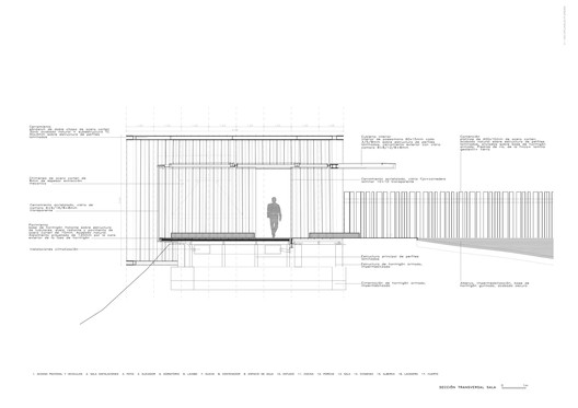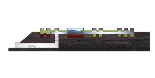 The longitudinal level is 1.5 metres below the field above, which drops by as much as three metres in the private spaces that can open or close to permit intimacy or meetings. The entrance is at the same level as the lower field.
