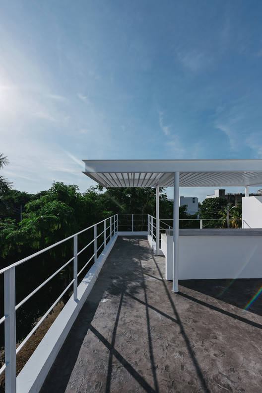 Text description provided by the architects. The solution was to remove vertical circulations from the inside, and the result was an intersection of two staircases, one closed and one open, which give the project a playful minimalism, but not in the plastic sense, but economic, taking the words of the client as a basis for the design. A façade with program, essential for the project, a façade that cannot be removed, with horizontal repetitions, which simplify the whole when seeing it in its entirety. The white color works as the guideline, as a integrator, leaving the sun to be the protagonist while painting the façade with light, turning the project into a canvas where the shadows can be seen in different forms throughout the day.