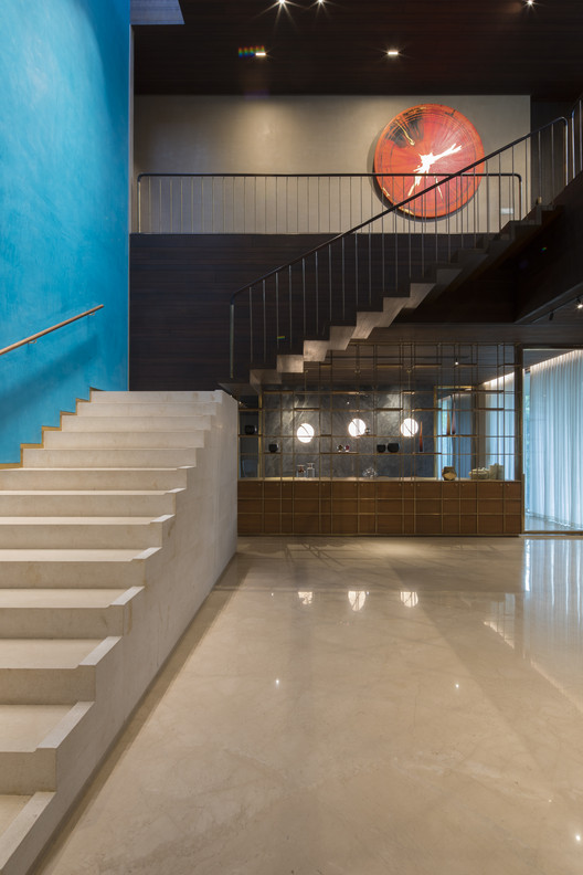 Text description provided by the architects. This is a private home in Ahmedabad, is an expression in Dhrangadhra stone. The stone used in many of the architectural antiquities of Ahmedabad. The stone has a mottled texture and bone coloration, available in blocks; slabs and dust from quarries nearby it became an obvious choice. It ages pretty well too. The cellular structure of this sandstone holds intermittent microscopic air gaps, acting as an insulation panel itself. This led to the idea of cladding the entire body of the house as a monolith. The organization of the plan is like a simple cross.