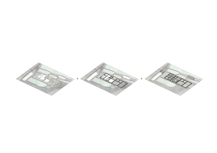 Journeying along the walls, guests can also ascend through openings above to gain privileged vantage points that look out across the gridded landscape and beyond to the surrounding lakes. Here three additional buildings take their place in the panorama; the rising second floor of the largest courtyard building, a lakeside pavilion of four guestrooms, and a multifunction building at the furthest reaches of the site. Renovating the existing derelict warehouse building, with a partial new concrete addition, this multifunction building houses a restaurant, a theater