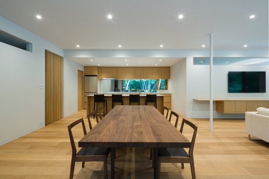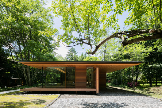 Text description provided by the architects. The site surrounded by the leafy woods close to the golf course in Minamigaoka Karuizawa, was planned to have its building lower than treetops of the woods to coexist with neighboring buildings.